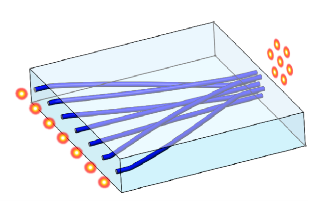 多芯光纤是空分复用技术的一种。由于多芯光纤和单模光纤在尺度和结构上的不同,我们使用基于三维光波导的扇入扇出(Fan-in Fan-out, FIFO)器件实现多芯光纤的复用和解复用。芯片一端为一维波导阵列,另一端是与多芯光纤匹配的三维结构。